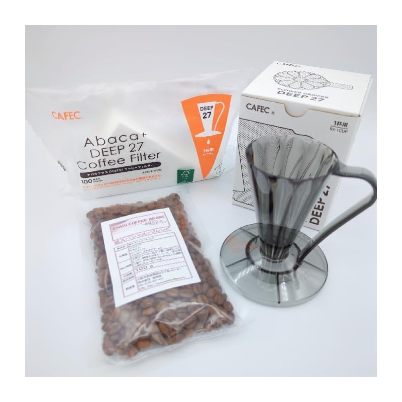 Coffee Bean Set, Flower Dripper DEEP27, Clear Black (1 Cup) FDD-27CB Abaca Plus (Bean Leave)