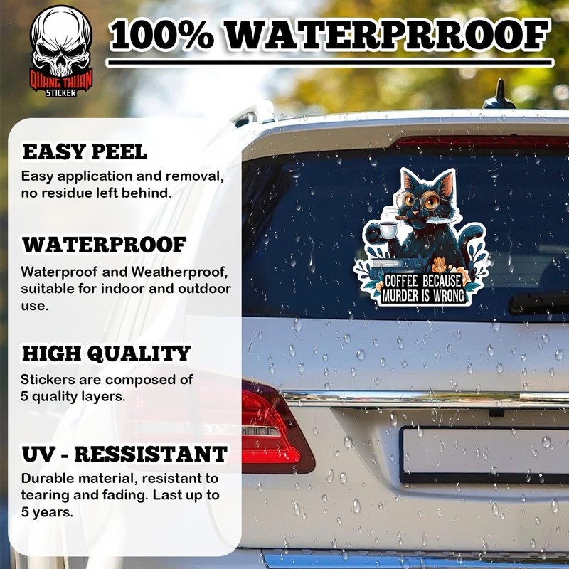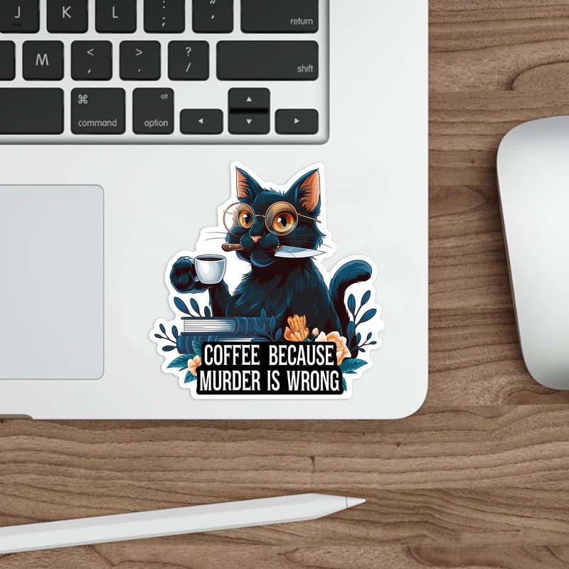 Coffee Because Murder is Wrong Sticker Black Cat Caffee Lovers Waterproof Vinyl Bumper Sticker Sticker for Laptop Water Bottle Hardhat Gifts for Her Him Adults