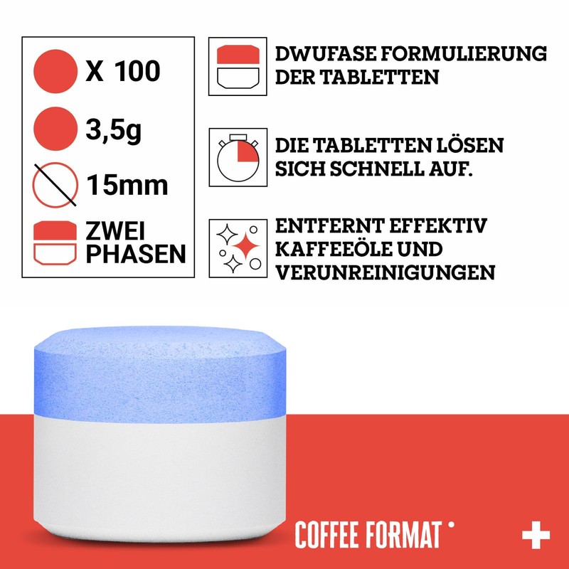 Coffee Format 2-Phase Cleaning Tabs Plus 100x3,5g, 2-Phasen Reinigungstabletten für Kaffeevollautomaten Entfernung von Kaffeerückständen Reiniger Tabs Kaffeemaschinen kompatibel mit Jura