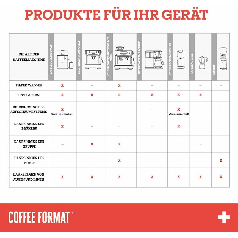 - JEDERZEIT PERFEKTER KAFFEESCHMECK: Regelmäßige Anwendung der Coffee Format 2-Phasen-Reinigungs-Tabs+ garantiert, dass jede Tasse Kaffee mit intensivem Aroma und perfektem Geschmack begeistert. Entfernt bittere Nachgeschmäcker und Gerüche, sodass das volle Aroma der Kaffeebohnen zur Geltung kommt.