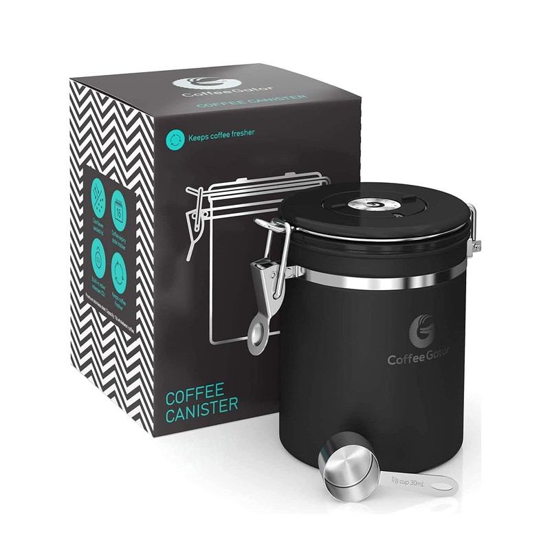 Coffee Gator Stainless Steel Coffee Grounds and Beans Container Canister with Date-Tracker, CO2-Release Valve and Measuring Scoop - Medium, 16 oz, Black