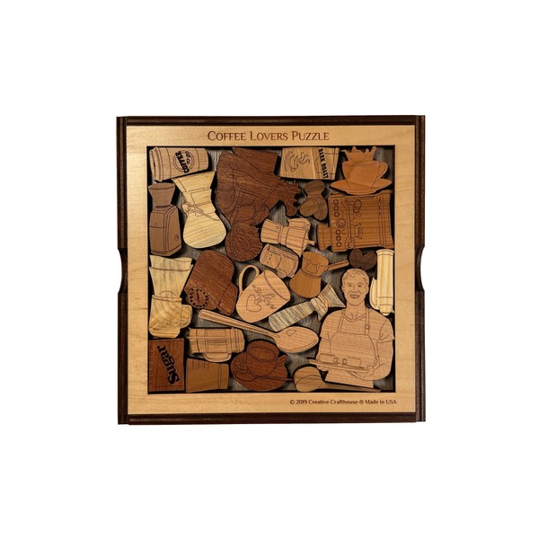 23 precision cut laser engraved hardwood pieces must be inserted into the frame. Quite challenging, best to attempt this with a little caffeine in the system! Precision laser cut with at least 4 different woods, 1/4” thick. Measures about 7” square in the fame and cover. Cover will fit over inner frame to protect all the pieces for storage or travel. This puzzle can be customized with a name on the inner frame or longer text on the cover for a small added fee. Could also customize pieces within the puzzle with a company logo or brand of coffee. Contact me if you want something like that. Comes packaged solved as shown in the picture. A Creative Crafthouse custom copyrighted design made in our Florida shop with artwork by Lynn Mueller