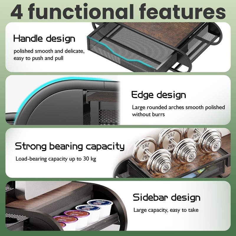 - Multi-purpose: This sturdy drawer is not only store the coffe pods but also a stand for your coffee maker, making it an all-in-one solution for your morning routine. You can also use it as an office desk organizer, a monitor riser, or a printer stand.