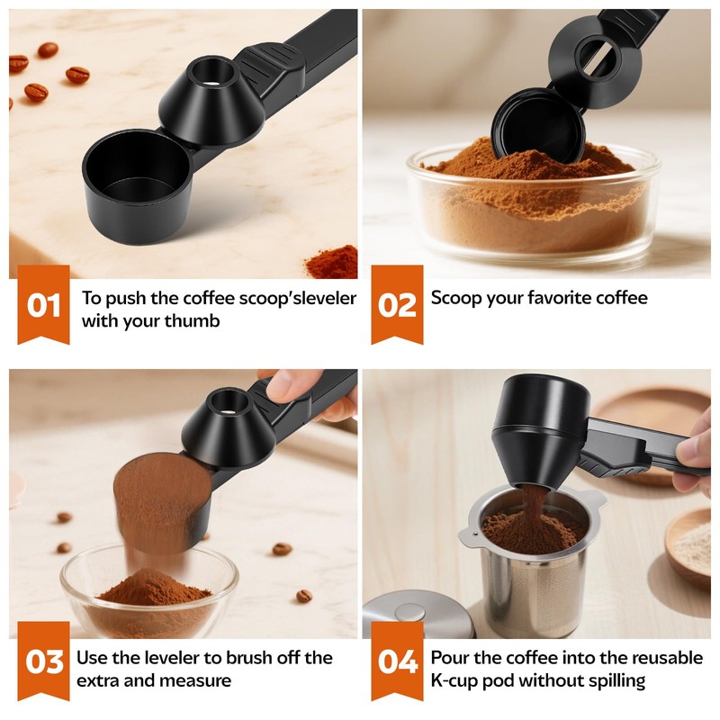 • Sliding Spoon Design: Use your thumb to push the scraper of the coffee spoon to scoop coffee grounds, slide to remove excess coffee grounds, and then flip the coffee funnel to pour coffee into a reusable K cup