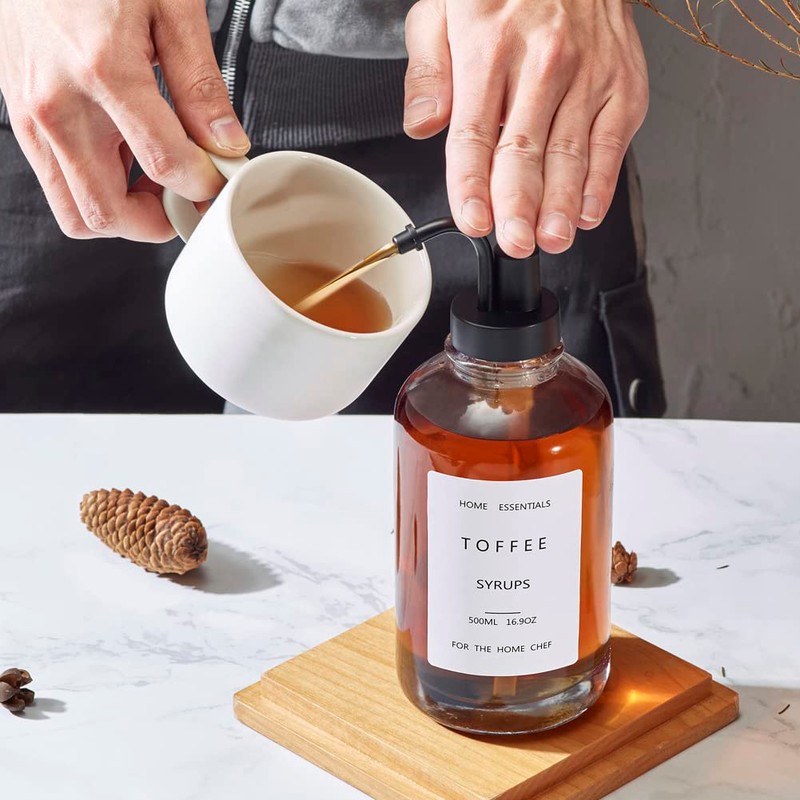 - Coffee Syrup Pump Dispenser Set Include : 4 Pack 16.9oz thicker glass syrup bottles, 4 elbow press pumps, 2 food grade silicone funnel, 32 syrup labels and 8 blank labels,can meet your needs maximize. Makes the pantry look neat and organized.