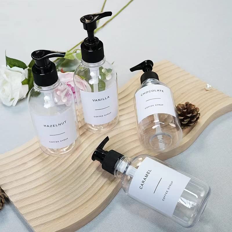Coffee Syrup Plastic Dispenser Bottle and 36 labels Syrup Dispenser Set - 4-Pack Clear PET Plastic Bottles with 5-Pack Pump, Ideal for Coffee Bar, Restaurants and Home Use