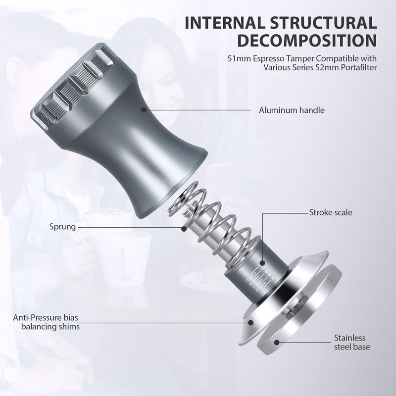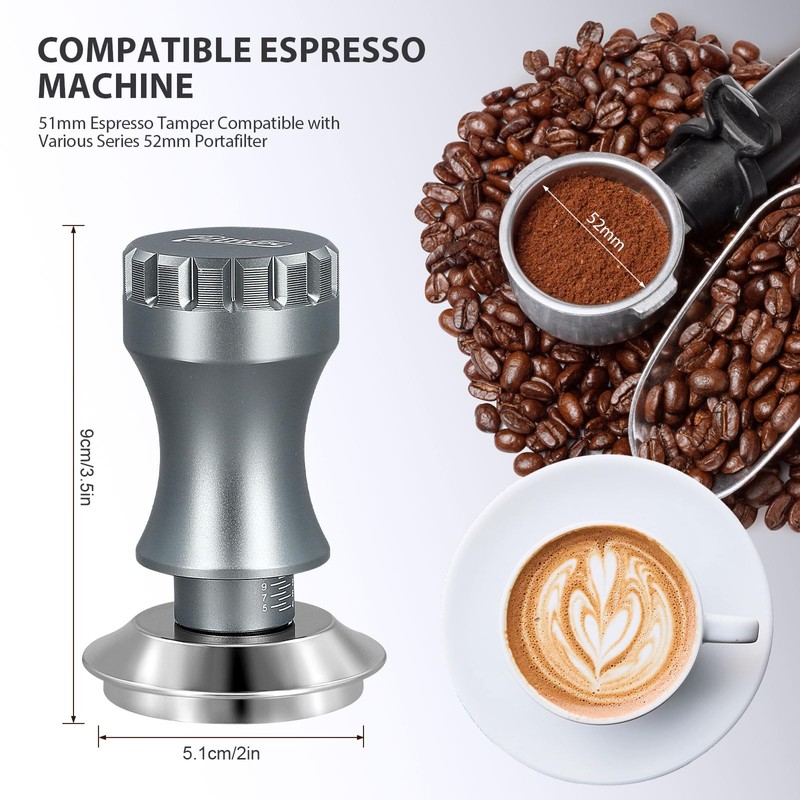 - ☕【Threaded Base, Built-in Spring】Our 51mm tamper is 2 interacting constant force springs-loaded and automatically adapts the depth according to the height of the powder without adjustment; Our coffee tamper set is perfect for beginners or professionals