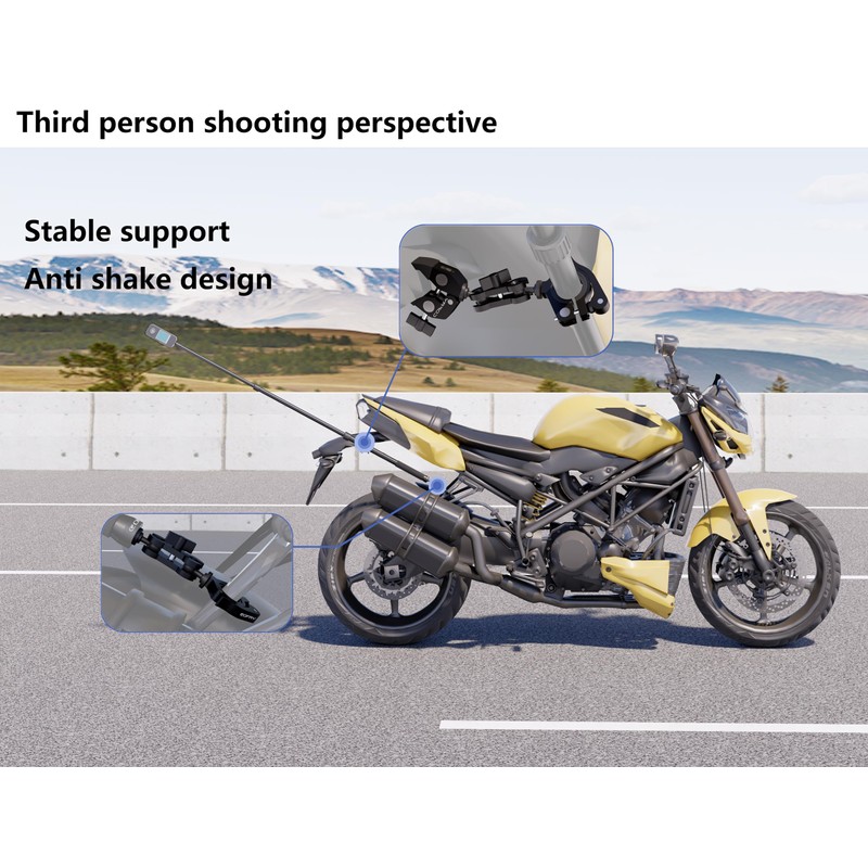 • Multi-scene flexible shooting, a clip steady as a rock: Aluminum alloy clamp is made of high-strength aviation aluminum alloy, strong bite, can easily clamp the motorcycle frame, mirrors, handlebars and other parts of the design of non-slip silicone pads to avoid scratching the body, to withstand high-speed riding vibration does not fall off. Match with [17.7-59 inch telescopic selfie stick], freely adjust the near and far viewing angle, easily capture the riding panorama or close-up picture.