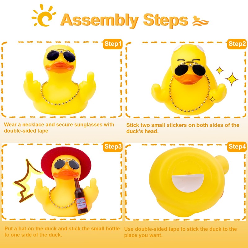 - 🐥 DIY Car Duck Dashboard Accessory: Put a top hat and fun sunglasses on the dashboard duck, stick on a beer glass, and put on a necklace. It's fun to create your unique dashboard duck decoration! They are perfect for rubber duck enthusiasts, pranksters, or anyone who enjoys laughing heartily.