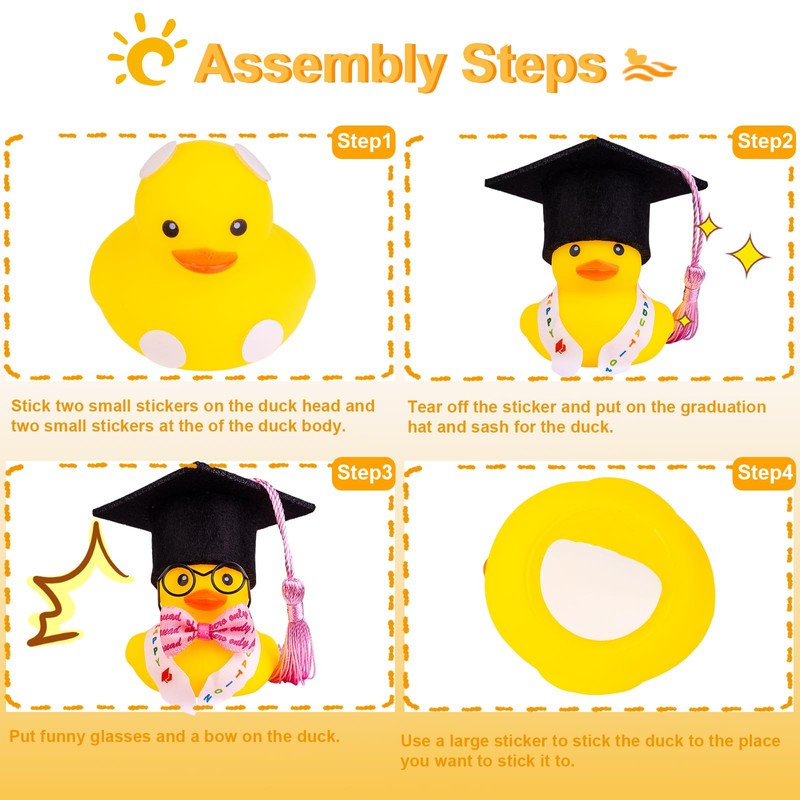 - Pato de goma para bricolaje: el pato de goma mini graduado, el sombrero de graduación, la banda, el collar y los lentes de sol son desmontables, y estos accesorios deben ensamblarse. Puedes ponerte fácilmente un sombrero de graduación y una correa de hombro para el pato, y luego ponerte anteojos de sol geniales para el pato, y combinar estos accesorios de pato juntos es simple y agradable. Si tienes alguna pregunta, ponte en contacto con nosotros.