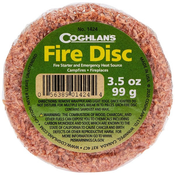 Coghlan's Fire Discs are an ideal fuel source for starting campfires or wood stoves. Made of cedar and highly refined wax, they are designed to light easily and to burn hot. Since most meals take less than 30 minutes to cook, they are also a perfect solution as an emergency source of heat for cooking. Each disc scored on one side to break easily into 4 parts.