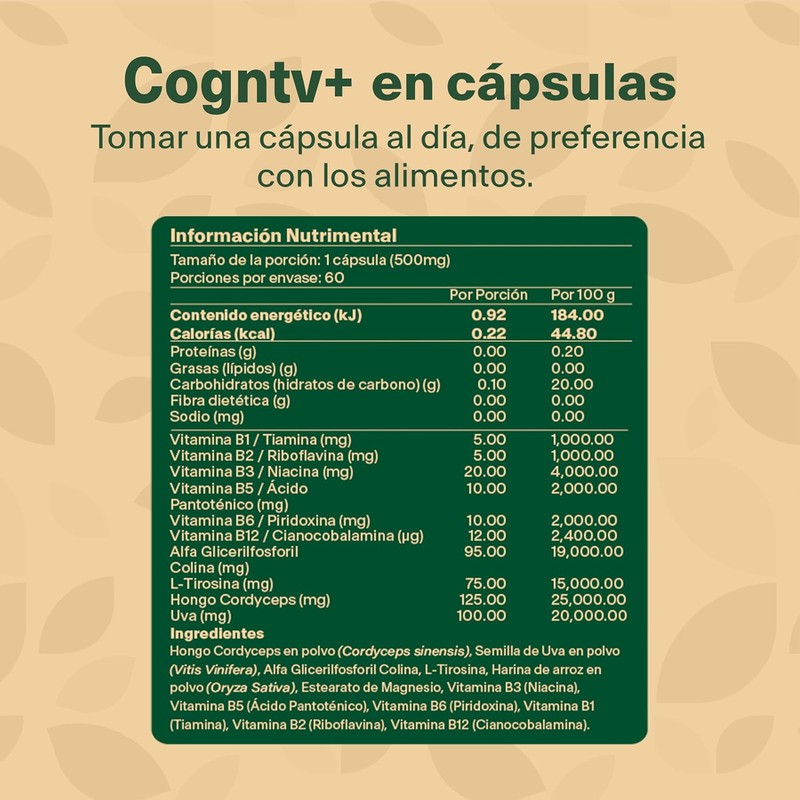 - Ingredientes | Vitaminas B1, B2, B3, B5, B6, B12, Alfa Glicerilfosforil, Colina, L-Teanina, L-Tirosina, Coenzima, Hongo Cordyceps y Uva. 60 capsulas de 500mg (2 Meses). Nootropico. Suplementos Alimenticios. Multivitaminico. Vitaminas para Mujer y Hombre.