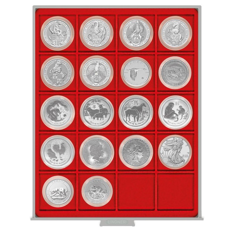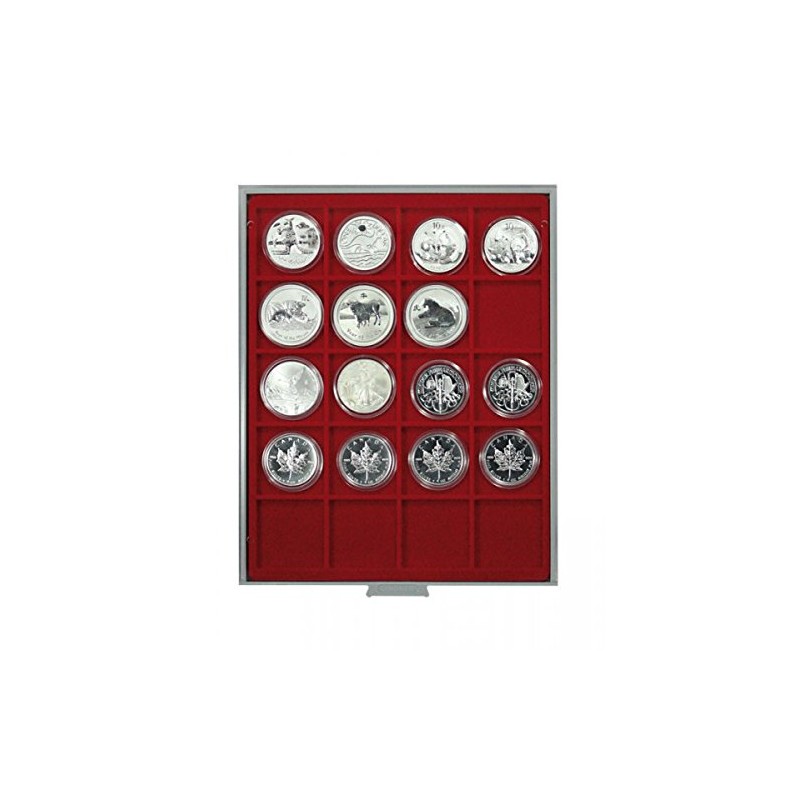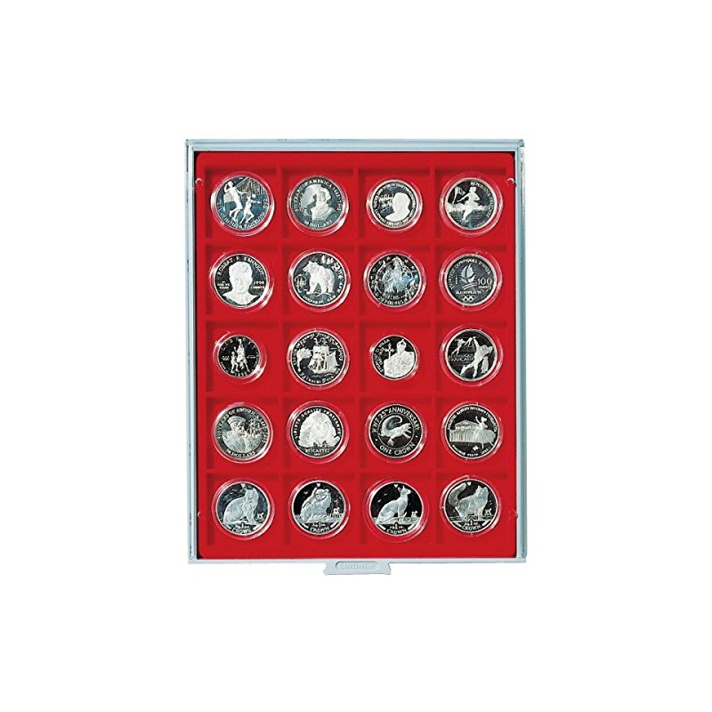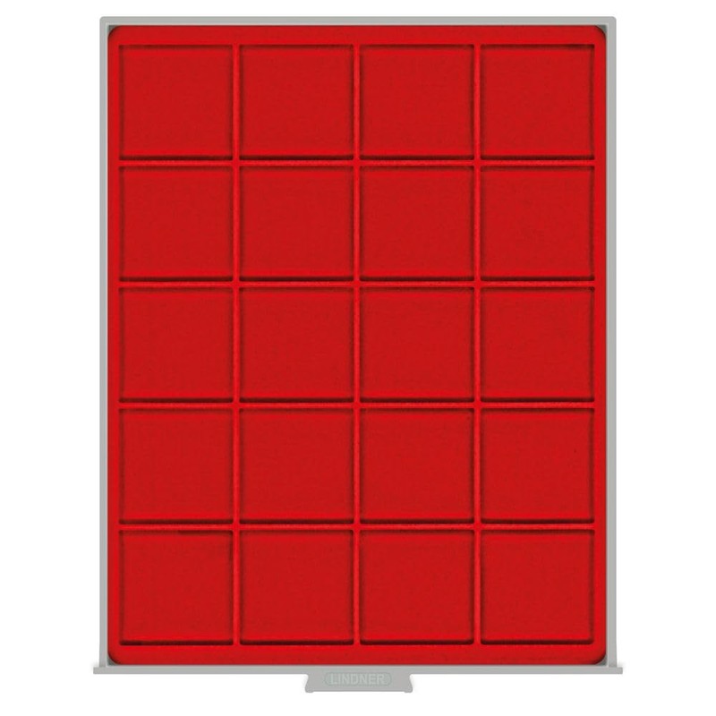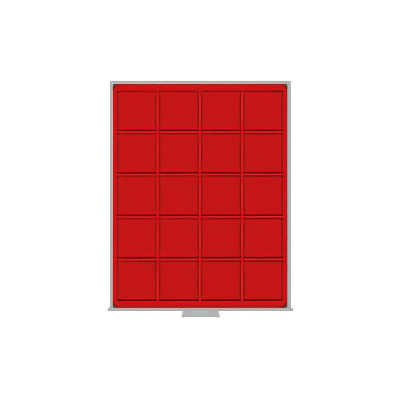 Coin box Standard with 20 compartments á 51 x 51 mm [Lindner 2121], With grey drawer, crystal clear frame and insert in light red velour