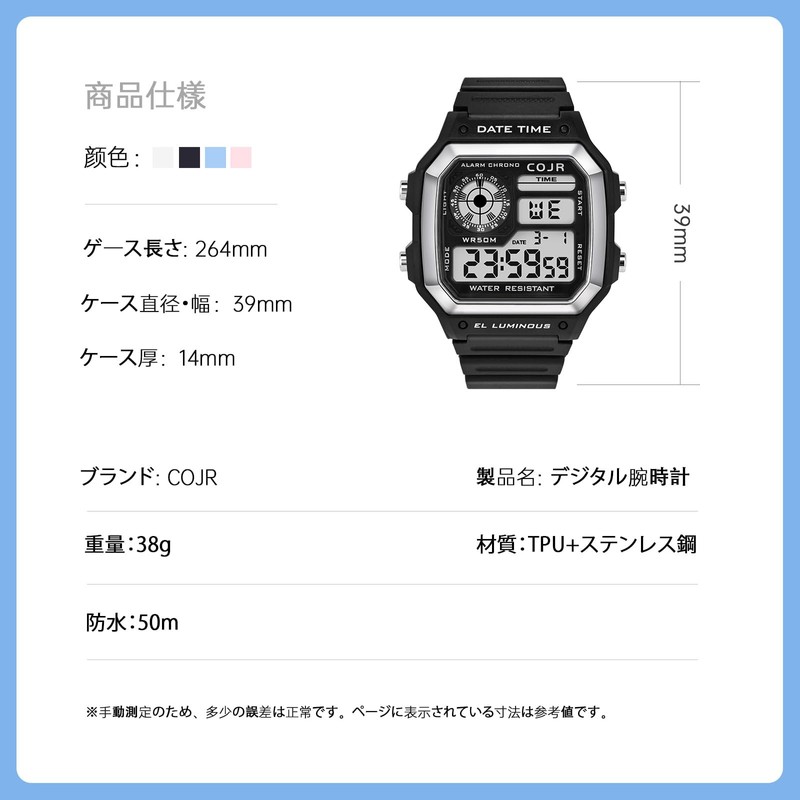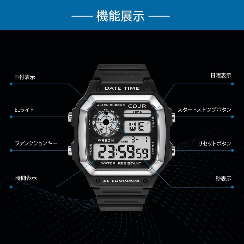 COJR Men's Digital Wristwatch, 5 ATM, Waterproof, Multi-functional, Alarm, Stopwatch, Date, Week, LED Color Light, Popular, Running, Simple, Outdoors, Stylish, Unisex, Japanese and English Instruction