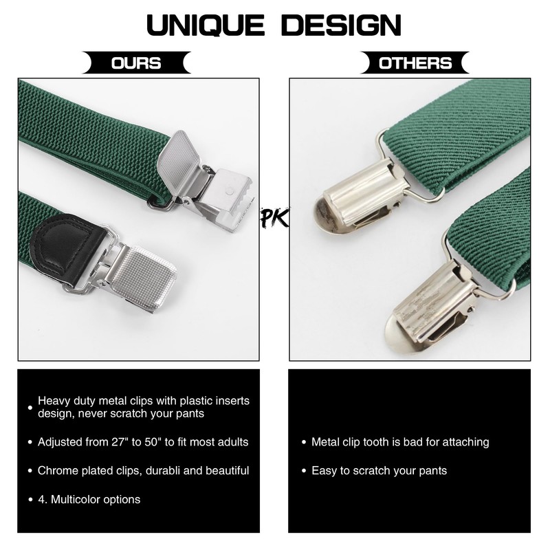 - [PREFERRED BY BIG PEOPLE]: With larger clips and more sturdy construction, these X-shaped suspenders are especially suitable for tall men. Measuring 1.5 inches wide, these classic suspenders are a casual choice for taller people. Fully adjustable. Our adjustable straps are 50 inches long and fit most adults. You will appreciate the durability of these heavy duty suspenders.