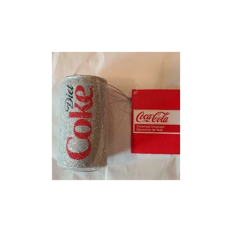 Diet Coke Can Ornament. This plastic ornament is shaped like a small can of Diet Coke with clear beads coating the label to offer texture. Complete with iridescent glitter and a silver thread loop, your tree will be as refreshed as you are this holiday!
