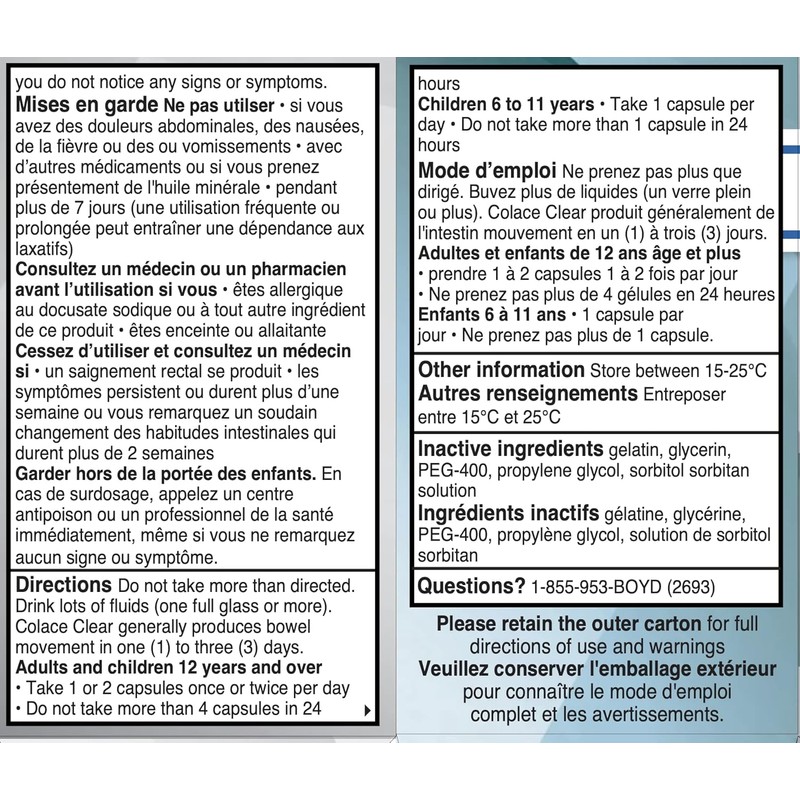- Colace is now available DYE FREE with the same active ingredient (Docusate Sodium).