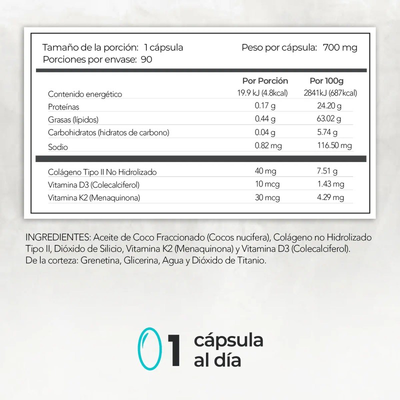 Colágeno Tipo II UC-II no desnaturalizado: Esta forma patentada de colágeno tipo II conserva su estructura original, lo que le permite interactuar de manera única con el sistema inmunológico para apoyar la salud de las articulaciones y reducir la degradación del cartílago. 💪🦴 ¡Un enfoque innovador para tus articulaciones! ✅ Vitamina D3 para la absorción de calcio: Esencial para la absorción de calcio y fósforo, nutrientes clave para mantener huesos fuertes y saludables. ☀️⚪ ¡Fortaleza ósea desde adentro! ✅ Vitamina K2 (MK-7) para la salud ósea: Dirige el calcio hacia los huesos y ayuda a prevenir su acumulación en las arterias, contribuyendo a la salud ósea y cardiovascular. ❤️🦴 ¡Apoyo integral para tu sistema! ✅ Cápsulas blandas fáciles de tragar: Su presentación en cápsulas blandas facilita su ingesta diaria sin sabor desagradable. 👌💊 ¡Cuidar de tus huesos y articulaciones nunca fue tan sencillo! ✅ Suministro para 3 meses: Con 90 cápsulas blandas, tendrás un tratamiento completo para disfrutar de sus beneficios a largo plazo. 🗓️⚪ ¡Invierte en tu movilidad y bienestar óseo!