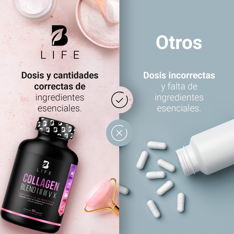 - ¡Disfruta la formulación exclusiva de Collagen Blend I, II, III, V, X B Life! Nuestra excepcional mezcla de 5 tipos altamente absorbentes del Colágeno: I, II, III, V y X es una composición valiosa para tus huesos y articulaciones. Además de estar enriquecida con Vitamina C y Ácido Hialurónico, activos importantes que otras fórmulas carecen. Contiene 90 cápsulas.