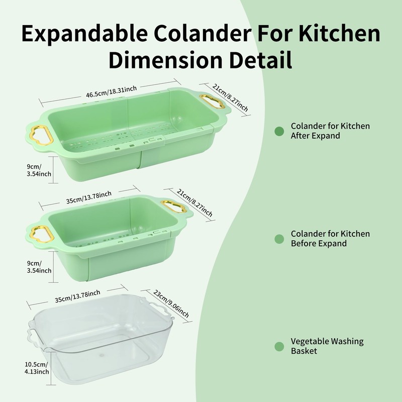 Size of Expandable Colander for Kitchen:8.27W x 13.78-18.31L x 3.54H inches / 21W x 35-46.5L x 9H cm