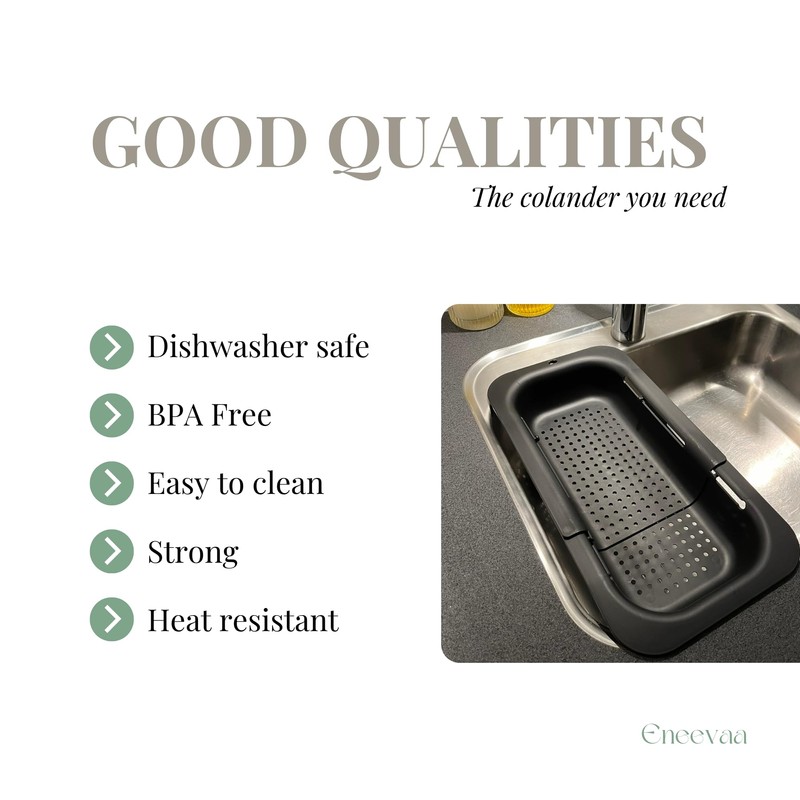 - [EXPANDABLE] The colander is equipped with extendable arms or handles that can stretch outward to span the width of a sink, providing a secure resting position for rinsing and draining. The arms are often non-slip to keep the colander stable over the sink.