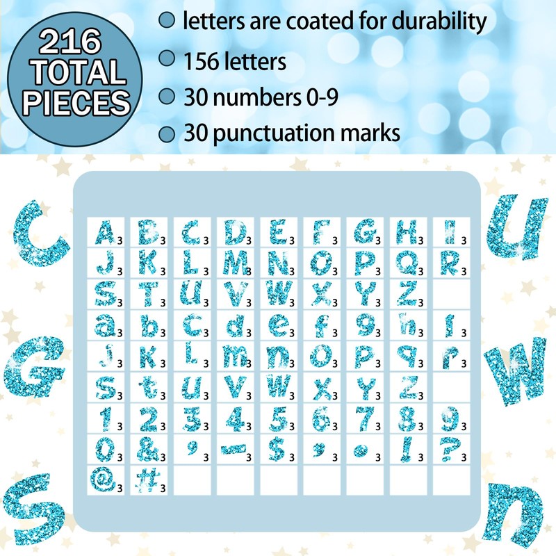 Colarr 216 Pcs Glitter Bulletin Board Letters for Classroom Numbers Alphabet 4 Inch Poster Board Letters with Adhesive Dots Punctuation Symbols Cutout Bulletin Display School Decor(Light Blue)
