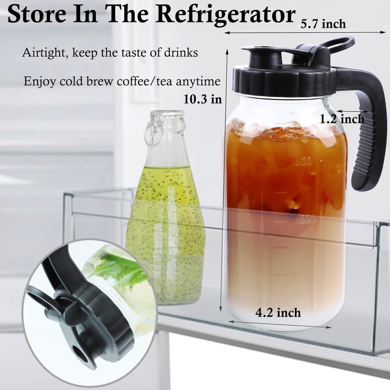Cold Brew Coffee Maker Half Gallon 2 Set Glass Mason Jar Pitcher With Spout Lid Filter 2 Quart Wide Mouth Iced Tea Brewing Jug Heavy Duty Handle Airtight & Leak-Proof Pitcher For Fridge Sun Tea 64 OZ