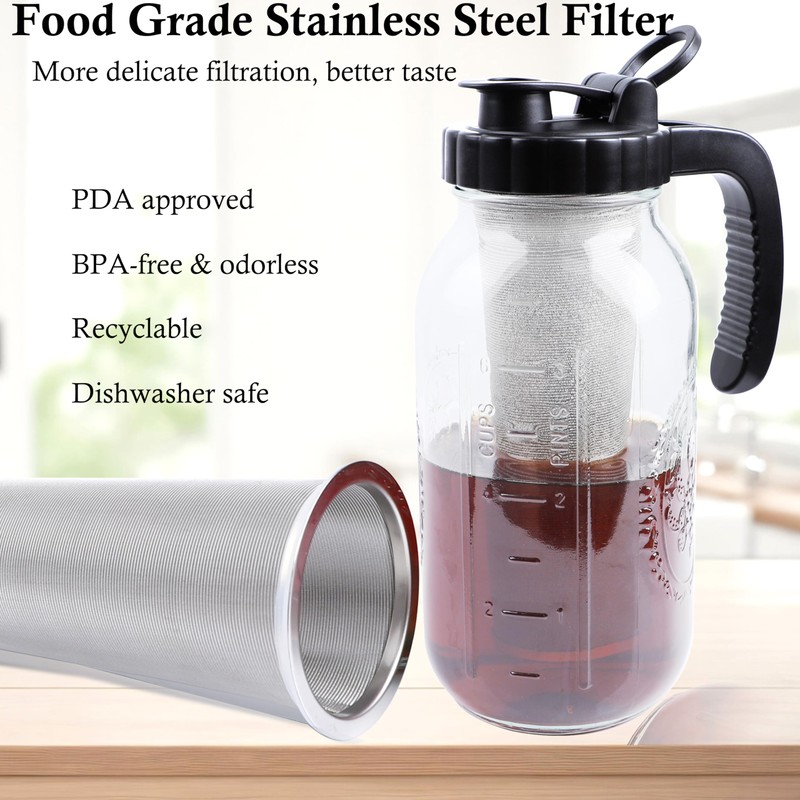 - Multi-Function Filters - Food grade mesh stainless steel filter, more delicate filtration! Its simplicity in design makes brewing a breeze - just add grounds and water, then let it work its magic overnight. Cleanup is a cinch too, thanks to its removable filter. If you're a cold brew enthusiast, this jar is a must-have addition to your kitchen arsenal.