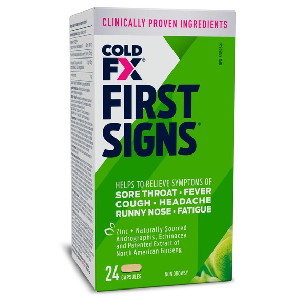 - MULTI-SYMPTOM RELIEF: COLD-FX FIRST SIGNS is a Natural Health Product that helps shorten the duration of upper respiratory tract infections; This non-drowsy formula helps relieve symptoms of sore throat, fever, cough, headache and runny nose