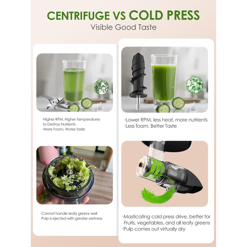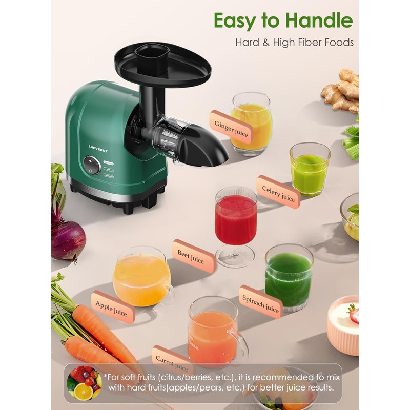 - đăChoose The Right JuicerăWhy this fruit and veggies juicer? The auger juicer runs at a low speed of 80RPM, which helps preserve all important enzymes and nutrients. One-speed control design, easy to handle soft & hard fruits and vegetables, especially for leafy greens. Centrifugal juicers utilize a fast-spinning blade that generates heat, which destroys enzymes and oxidizes nutrients. Conversely, the juice extracted by the slow juicer has a rich taste and maintains its original taste.
