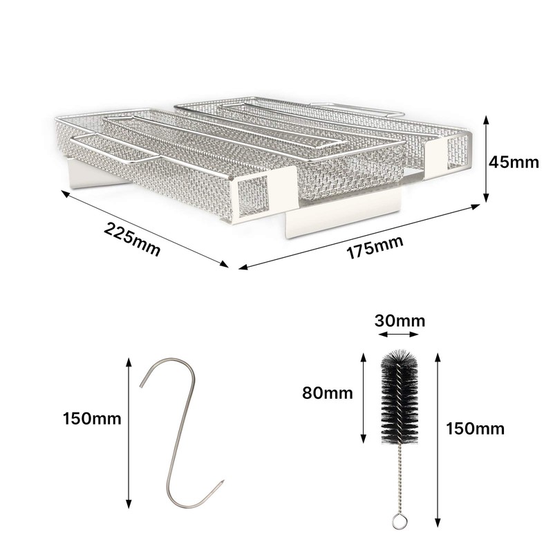 - Contents: 1 x cold smoke generator, 1 x BBQ cleaning brush, 5 x hooks. Please note: Power supply is not included