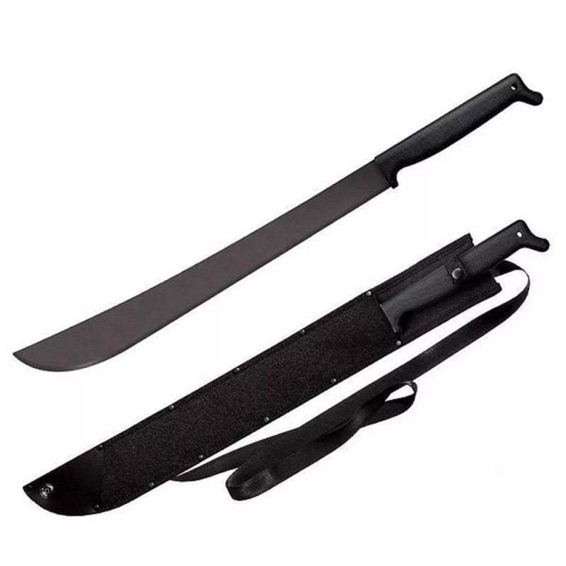 New Two Handed Latin Machete Construction: 1055 Carbon Steel; Overall: 30"; Blade: 21" l Carbon Steel l Standard Edge l Matte Finish; Handle: Black l Polypropylene; Other Info: Black baked-on anti-rust matte finish blade. Black Cor-Ex shoulder sheath. Lanyard hole. BulkPacked.
