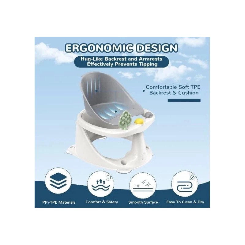 Coldew 1.8lbs Gray Baby Bath Seat Non-Slip Suction Cups & Temp Display