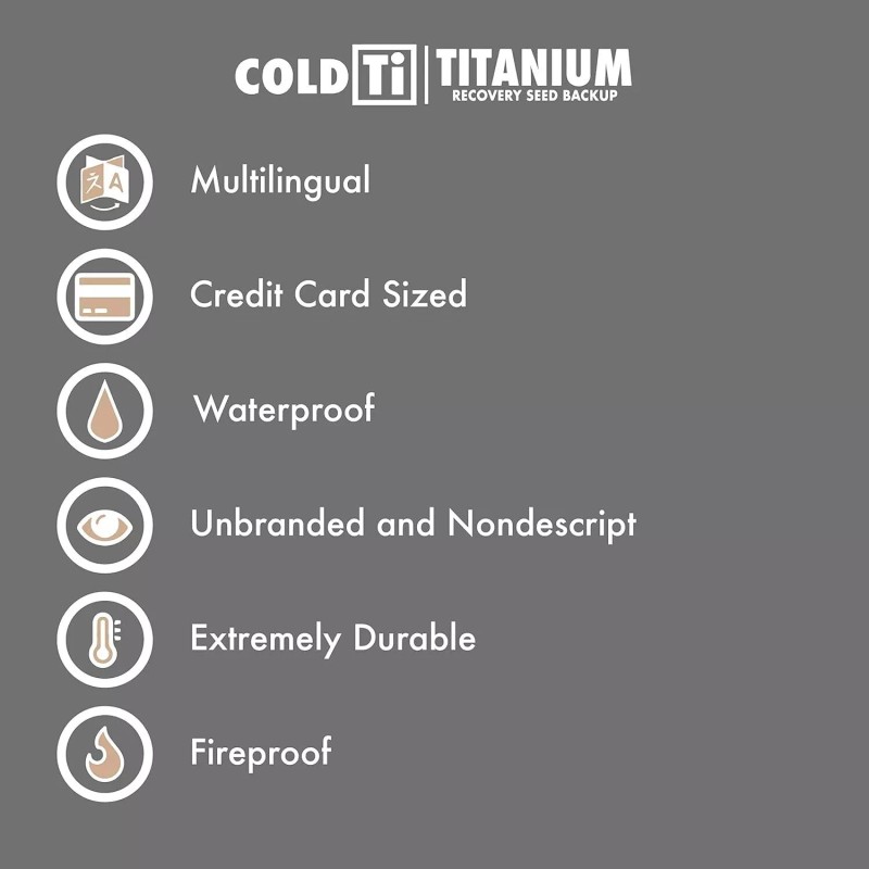 • TITANIUM CONSTRUCTION, HIGHER MELTING POINT THAN STEEL: Crafted from Commercially Pure Grade 2 industrial-strength titanium, ColdTi's premium seed phrase emerges as a stalwart defender against the ravages of time and the elements. Rust-proof, water-proof, and with a higher melting point than steel, these plates guarantee the long-term preservation of your crypto seed. ColdTis titanium seed phrase storage grants you the confidence that your assets are shielded against unforeseen circumstances.