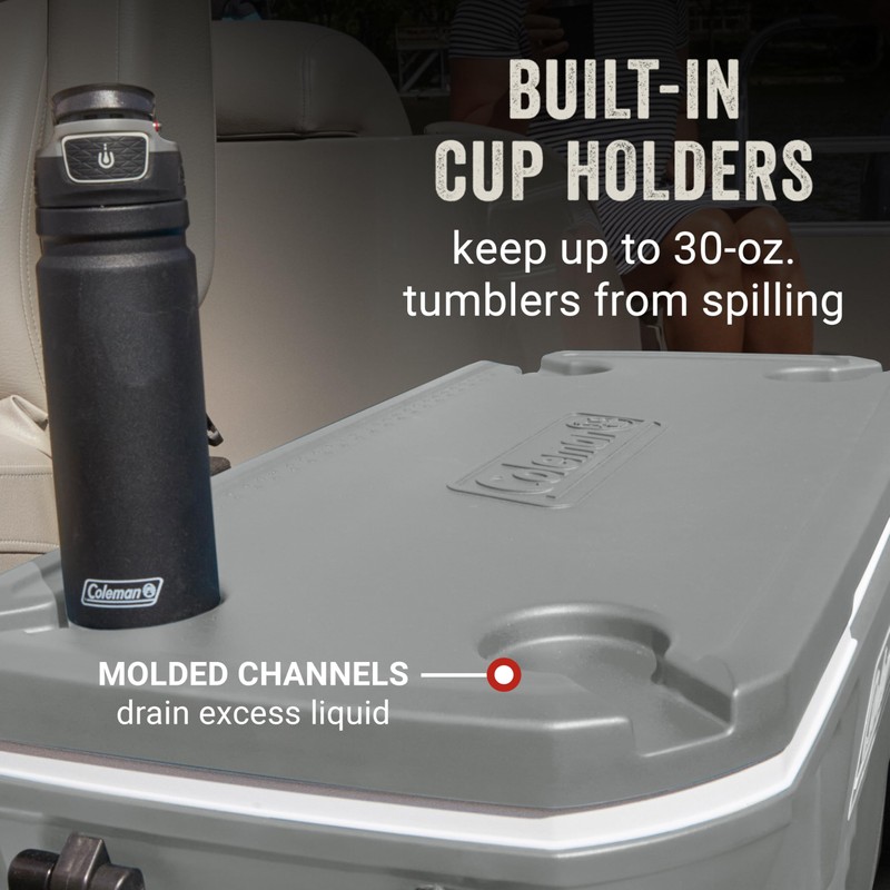 • CUP HOLDERS WITH DRAIN: Molded into the lid to keep drinks from spilling; fit up to a 30-oz. tumbler
