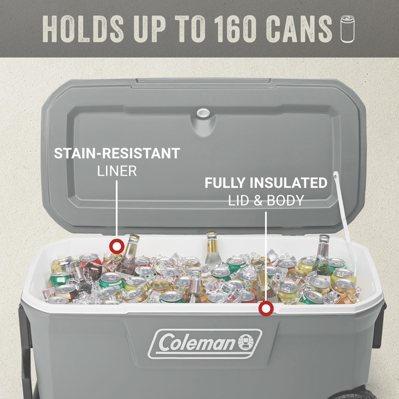 Coleman Classic Series Insulated Portable Rolling Cooler with Wheels, Leak-Resistant Outdoor Hard Cooler Keeps Ice up to 5 Days, 100-Quart