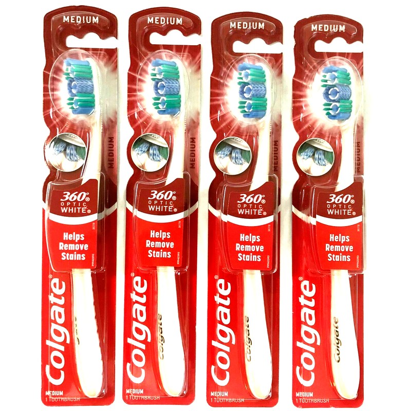 - The Colgate 360 Optic White medium manual whitening toothbrush is designed with whitening cups that hold toothpaste to effectively help remove surface stains for a naturally white smile. It also features polishing spiral bristles, a cheek & tongue cleaner, and an ergonomic handle design.