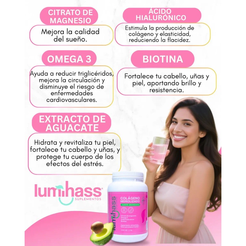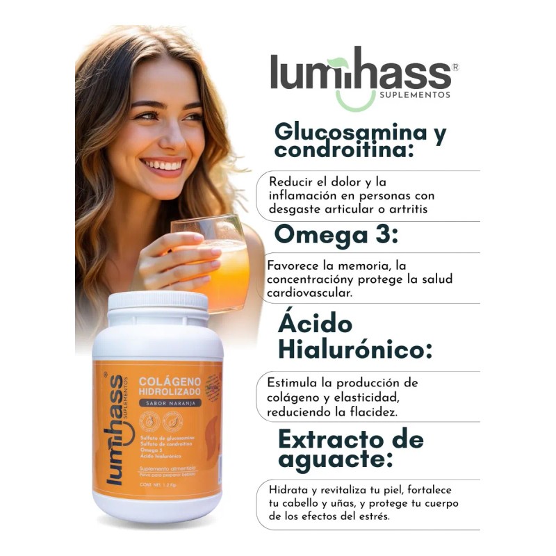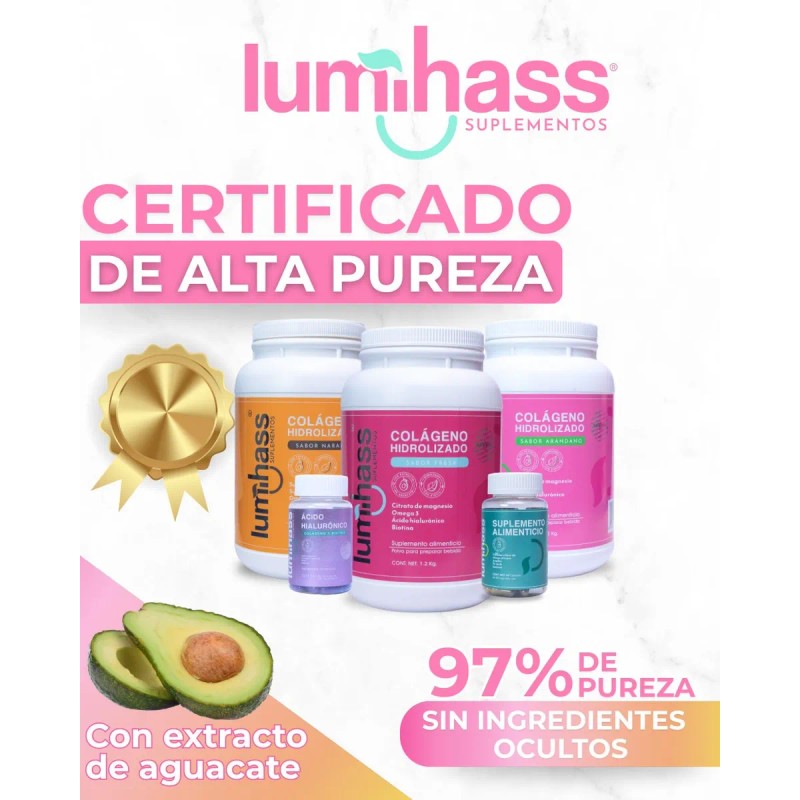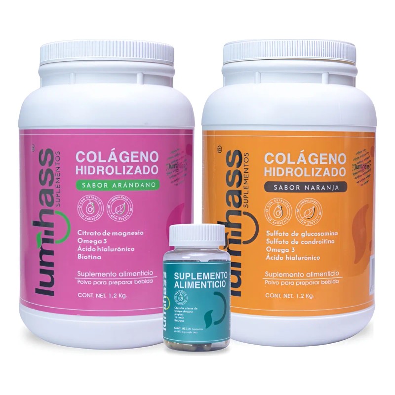 Colageno lumihass 2 piezas 1 sabor arandano 1 sabor naranja + detox 30 de regalo. En Lumihass, creemos en la transparencia y la calidad real. Por eso, todos los ingredientes que ves en nuestras tablas nutrimentales y lista de ingredientes son 100% reales, verificados y presentes en cada porción. No solo están declarados en la etiqueta: están en tu producto, con la calidad premium que mereces. Nuestro colágeno hidrolizado está formulado con ingredientes de la más alta calidad, cuidadosamente seleccionados para brindar resultados visibles y efectivos. Adicionado con extracto de aguacate y omega 3, potenciamos sus beneficios para ayudarte a mantener una piel firme, articulaciones saludables y cabello y uñas más fuertes. El omega 3 incluido en nuestra fórmula es conocido por sus propiedades antiinflamatorias y su capacidad para mejorar la salud cardiovascular, cerebral y articular, contribuyendo también a una mejor elasticidad y apariencia de la piel desde dentro.