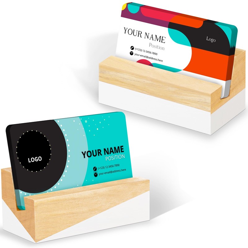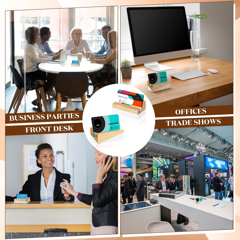 - Versatile Color Scheme: complement your desk decor with this business card display stand in two attractive colors; Whether you prefer the striking simplicity of white or the timeless appeal of natural wood, this card display with geometric patchwork pattern is the great blend of style and function