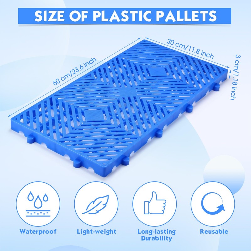- Material: Featuring quality plastic, our pallets ensure long-lasting durability, making the pallets a addition to the warehouse, manufacturing site, or storage room. The versatile size of 23.6 x 11.8 x 1.18 inches/ 60 x 30 x 3 cm fits in any space