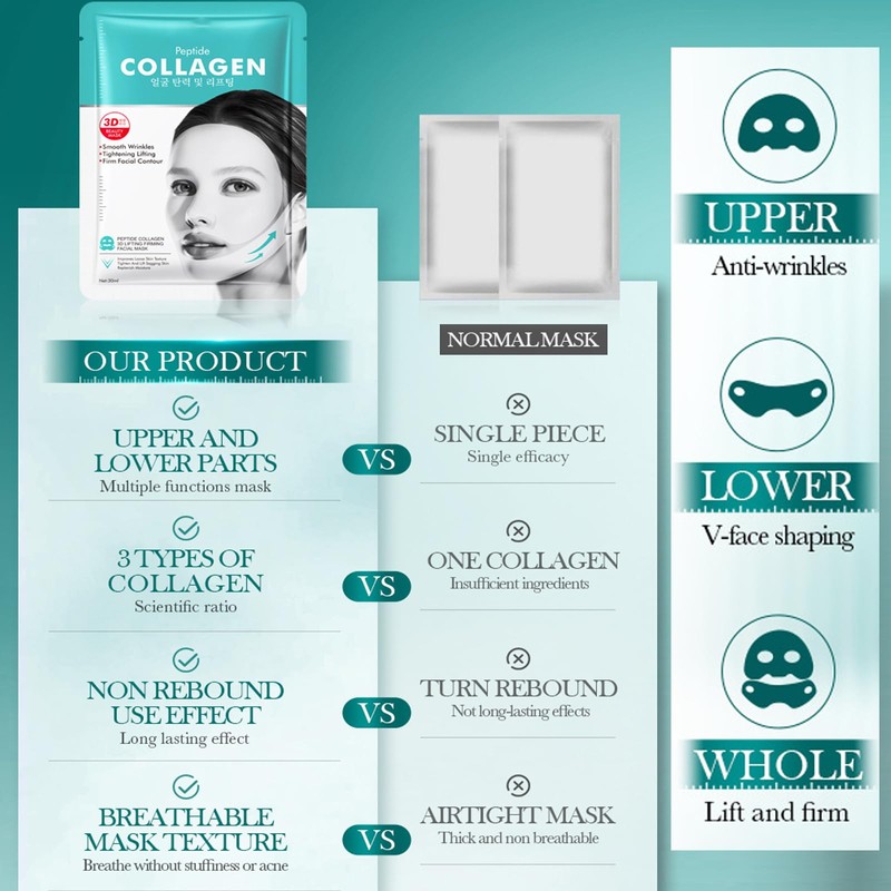 - 【Firming Skin】collagen face mask maximizes skin penetration and absorption. Strengthens and firms skin, smoothes fine lines and wrinkles. Enhances skin vitality. At the same time type of mask can better lift your sagging skin under the chin and create a firm jawline.