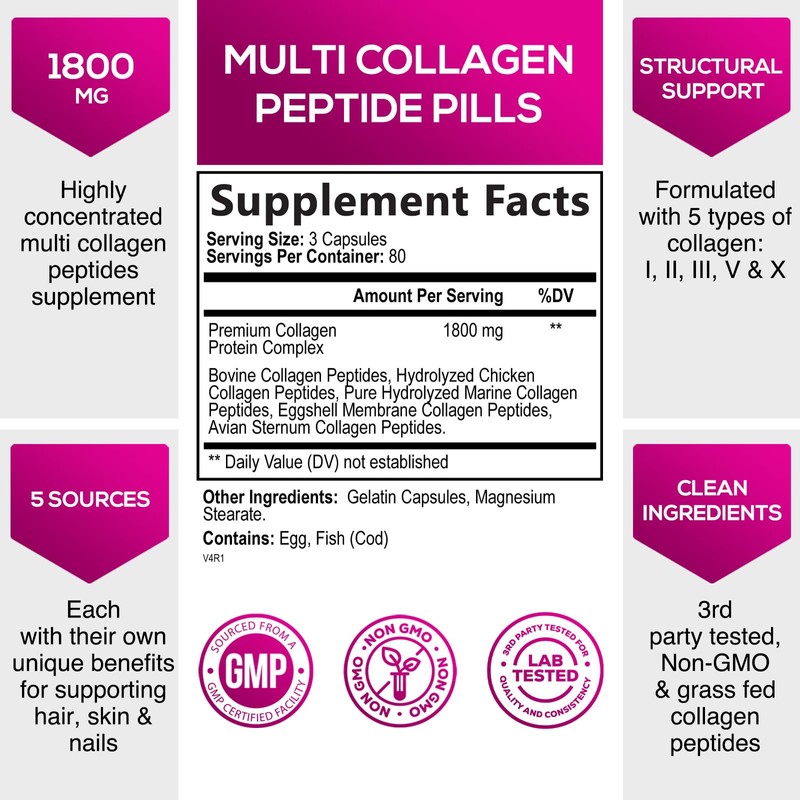 - Comprehensive Multi Collagen Capsules: Our multi collagen peptides capsules contain Type I, II, III, V, and X collagen from grass-fed, non-GMO sources; these collagen supplements support hair, skin, nails, and joint health for both women and men