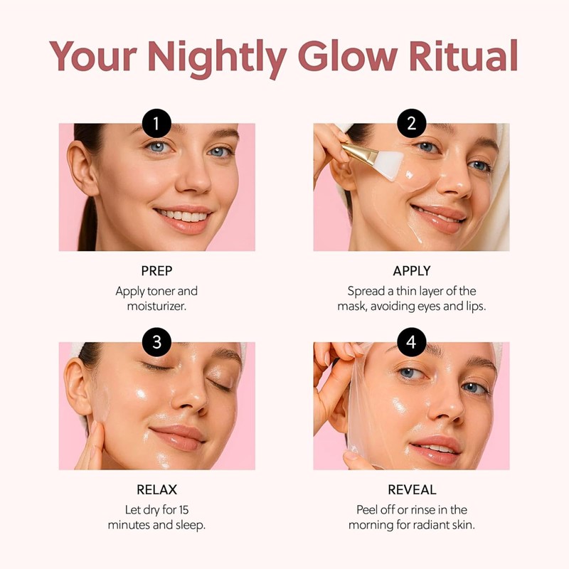 - Peel off gently in the morning and rinse your face for a refreshed, glowing look.