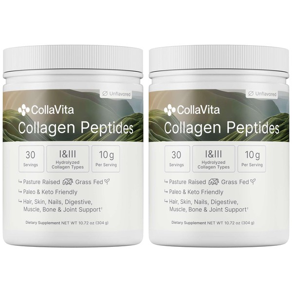 Colla Vita Collagen Peptides Powder Grass-Fed Pasture-Raised Hydrolyzed Collagen Powder, Type I & III Hair, Nails, Skin and Joints, Non-GMO, Paleo & Keto, Unflavored, 10 Fl oz. 2 Pack, 30 Servings