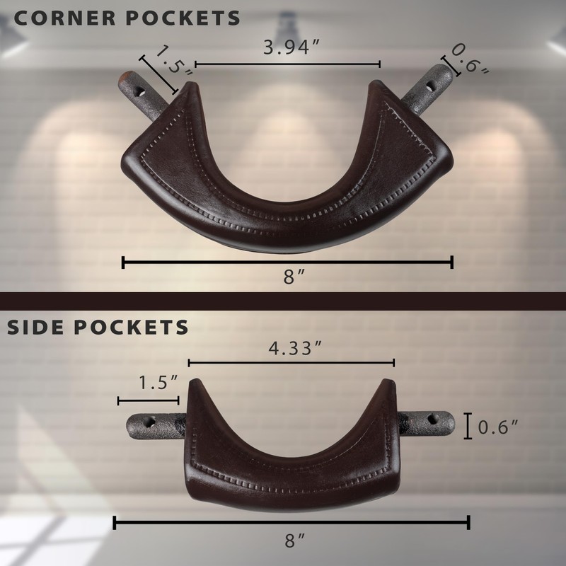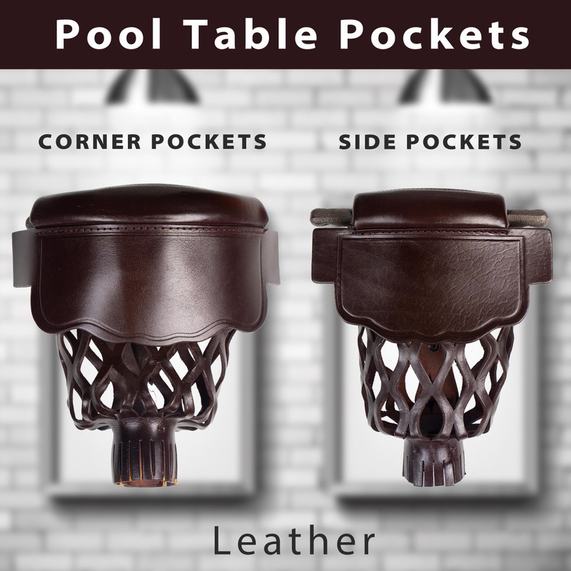 Collapsar pool table pockets are made of real leather,diamond pattern with shield、brick pattern with shield and smooth leather with shield are available,Black and Brown color are available.Each set come with 4 corner pockets and 2 side pockets,install screws,bolts,gaskets and spanner.Fits most standard size pool tables,Please verify the dimensions before purchasing.