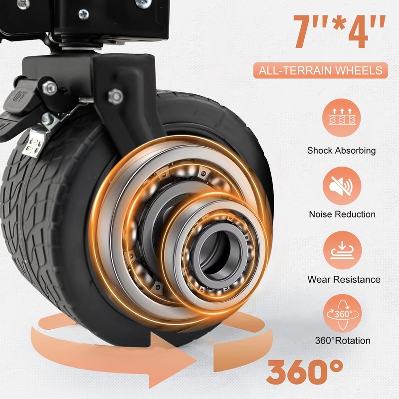- All-Terrain Large Wheels: This collapsible wagon with table has large 7×4-inch wheels to handle sand, gravel, and uneven terrain. Its silent 360° swivel front wheels ensure smooth maneuverability, while dual brakes provide quick stopping power to prevent sliding on slopes and ensure safety