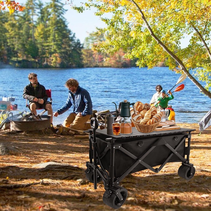 - Wagon With Table: This foldable wagon features a 35" x 18.8" desktop (approx. 89 x 48 cm) with a 220 lb (100 kg) weight capacity, delivering an expansive and rock-solid workspace. The ergonomic 26-inch (66 cm) table height ensures comfortable posture for outdoor dining, food prep, gaming, or any activity – letting you enjoy every moment naturally relaxed
