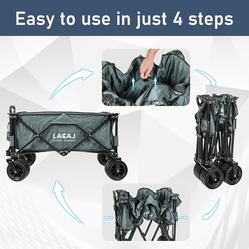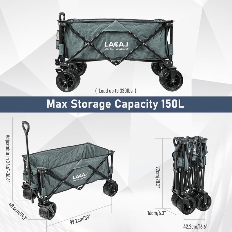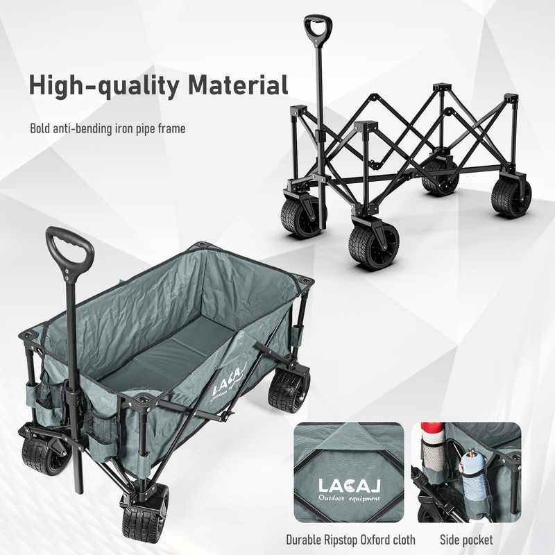 - Excellent Quality—— This collapsible wagon is made of 600D Oxford fabric and PVC material that are durable, waterproof, and won't tear when you put something sharp in it. Premium steel constructs the super folding sports wagon , even able to support 330 lbs