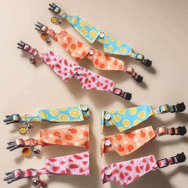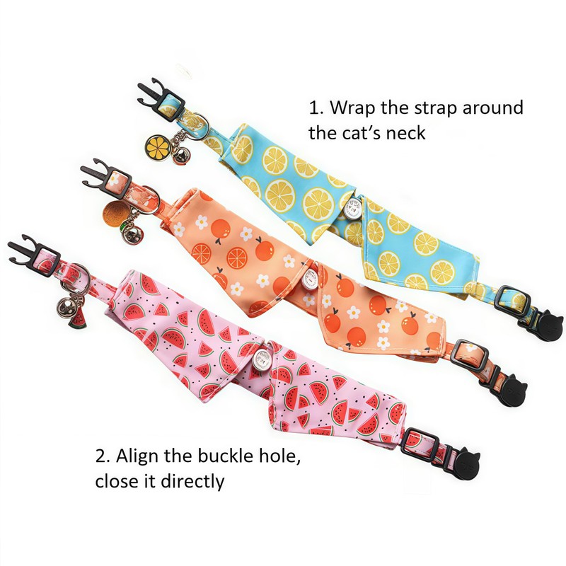 Our cat collars are made from cotton fabric that are both soft and durable, ensuring your cat's comfort throughout the day. They come in a variety of colors and fruit patterns, allowing you to choose the one that best suits your cat's personality.