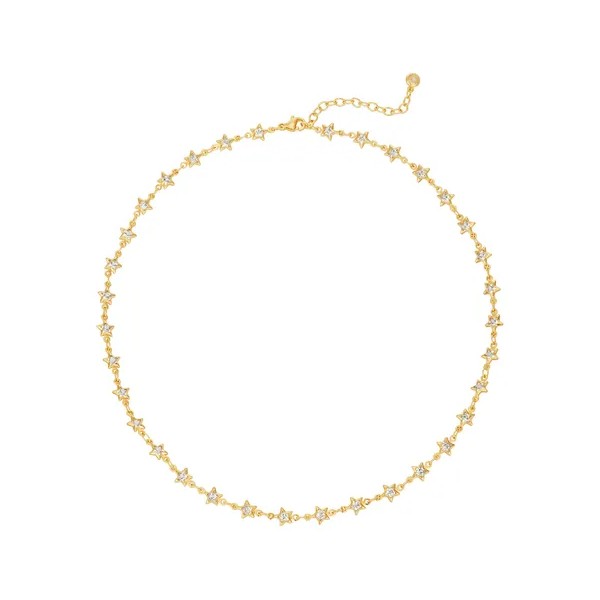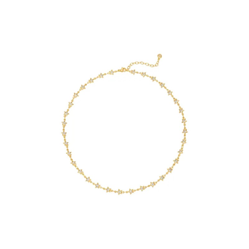 Este collar combina la elegancia dorada con estrellas brillantes de zirconia, creando un accesorio lleno de brillo y estilo. Ideal para quienes buscan una pieza única y sofisticada.
